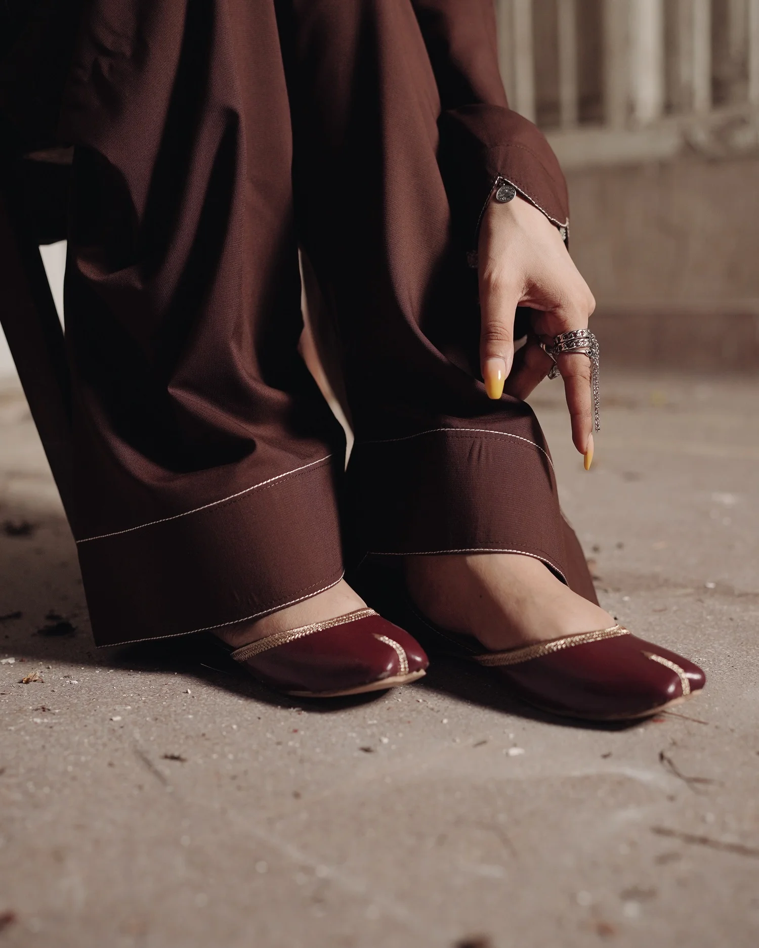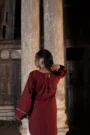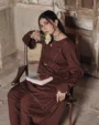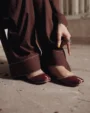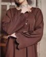The chocolate brown short shirt features a stylish V-neck with subtle coin detailing that enhances its traditional charm. The full sleeves are designed with round cut details and coin embellishments, giving it a unique and timeless appearance. Paired with a matching farshi shalwar, this outfit offers comfort and effortless style for daily wear.