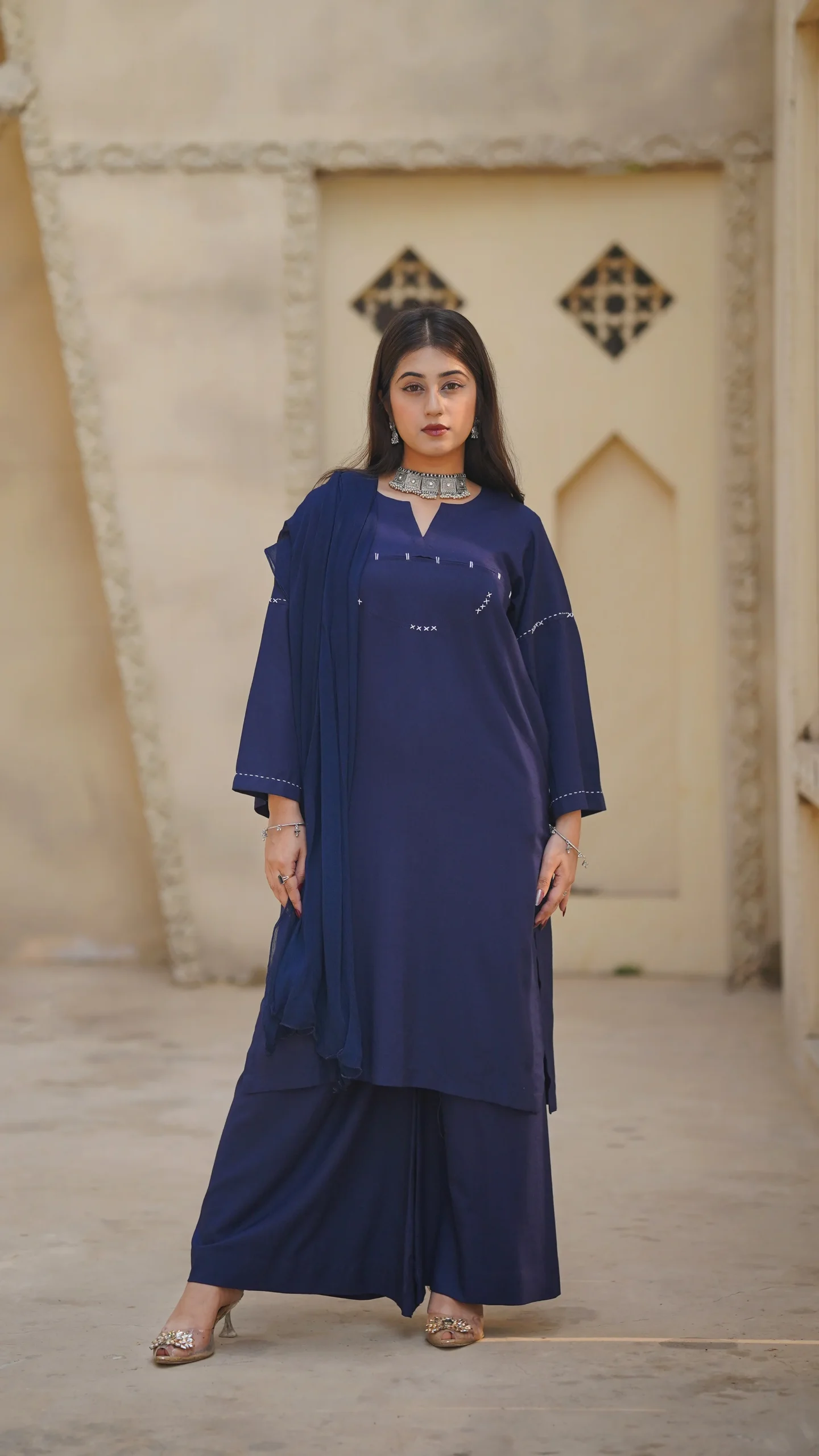 Stay warm and elegant this season with this beautiful navy blue dhanak kurta set for women. Designed for winter comfort, this outfit gives a graceful Pakistani traditional look with a simple and classy style.